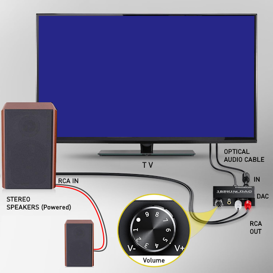 TV sound out from optical to DAC to RCA white and red to powered speakers RCA inputs. Secondary speaker is usually connected to the primary speaker