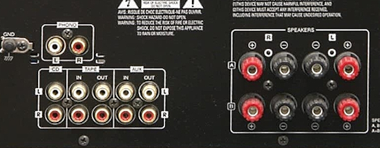 | Home • Car Stereo Systems GOOGLE SEARCH Stereo Hookup How to connect speakers, amplifier, receiver, tape, turntable on your home stereo system ![]() ![]() Stereo Receiver (Rear) Analog Stereo Audio Inputs on the left and Speaker Outputs on the right. Notice there are two sets of speaker terminals, an "A" set (top row) and a "B" set (bottom row). The "A" pair is normally the main pair of speakers connected. The "B" pair is for another room or a possible subwoofer speaker connection. ![]() For binding post speaker terminals, loosen the red (positive) or black (negative) binding posts by turning them counter-clockwise. Insert the speaker wire into the slots under the binding posts and then turn the binding posts clockwise to tighten. These can also accept a banana plug for easy disconnect and connect. ![]() Budget stereo amplifiers may have spring clip speaker terminals. You may see only one row, two red and two black terminals. To hook up spring clip speaker terminals, strip about 1/2 inch of insulation from your speaker wire, twist the copper strands tight, then press on the spring clip tab to open the slot, insert the twisted wire, and release the tab to secure it. Always match positive (red) to positive and negative (black) to negative on both the speaker and amplifier, and ensure no stray strands touch other terminals. ![]() Speaker connections - spring clips ![]() How to connect Speakers ![]() Stereo means 2 channels, a left channel and a right channel. A stereo receiver or amplifier allows 2 channel input devices such as a turntable for playing vinyl records or a Compact Disc player or a magnetic tape player/recorder to be connected and then amplified for output to a left and a right loudspeaker. ![]() ![]() Speaker Connections (rear) Passive Speaker Connect two speaker wires from the amp/receiver left speaker terminals (black and red) to the same color terminals on the left passive speaker. Connect two speaker wires from the amp/receiver right speaker terminals to the same color terminals on the right passive speaker. Passive and Powered Speakers Powered speakers have a built-in amplifier inside one of the speakers. These type of speakers only require a line level (low level) input signal. This can be RCA analog stereo signals or digital stereo signals such as from an optical audio connection. ![]() Passive speakers only have the speaker(s) inside and require an external amplifier. They accept a high-level (or speaker-level/amplified) signal. ![]() ![]() Bluetooth wireless audio is available on even the most inexpensive stereo receivers. This means you can play music from your smart phone on the stereo system in addition to other stereo input devices. ![]() Connect input devices using RCA cables (white and red) for analog audio. ![]() ![]() Select the source input you want to play using the front panel of the receiver or the remote control. Adjust the volume. ![]() Connect stereo to TV An inexpensive mini-stereo amp can drive small speakers to enrich TV sound. Use a DAC (digital to analog converter) to connect the TV optical audio output to the amp's RCA inputs. ![]() This is one way to connect headphones to a TV without a headphones port. Be sure to get a DAC with volume control. Select in the TV settings, the sound output to go from Optical instead of TV speakers. Connect stereo to Phone A phone with a headphones output (3.5mm) can plug into the stereo using a 3.5mm (male) to RCA adapter cable. A phone without a headphones output will usually have a USB-C port and you can use a USB-C to 3.5mm (female) adapter cable along with the 3.5mm (male) to RCA adapter cable to connect to the stereo CD input or AUX input. Select the correct source input on the stereo. ![]() ![]() You could also use Bluetooth wireless audio. Make sure Bluetooth is enabled on both the phone and stereo. For older stereo systems, you can use an external Bluetooth receiver plugged into the stereo. Connect a laptop 3.5mm headphone out using an adapter cable to the amp for external speakers. Connect a DVD player's RCA audio outputs to the amp for richer sound from movies. Also you can get a RCA audio switch so you can connect multiple audio inputs and select the device you want without disconnecting and reconnecting the cables to the amp. ![]() Q: Are speaker wires and RCA cables the same thing? A: No, speaker wires are for high level signals (amplified) while RCA cables are for low-level signals. Phono (Turntable) input How to Connect a Turntable - Analog Audio ![]() ![]() RCA analog audio cables - Stereo Connect the white cable from the turntable to the white IN port on the amp or receiver. Next connect the red cable to the red IN port on the amp or receiver. Next connect the ground wire from the turntable to the ground (GND) terminal on the amp or receiver. Select the PHONO input on the amp or receiver. Adjust the volume. Stereo sound in the home became very popular in the 1970s. Many companies in Japan and the U.S. made excellent stereo components which can still be found today. In those days companies produced amplifiers, tape decks and turntables of very good quality. In the decades to follow, build quality suffered in the effort of some companies to increase profits at the expense of quality. The typical home system consisted of a receiver, turntable and two loudspeakers. Some people also had a reel to reel tape recorder. A receiver is a combination amplifier and AM/FM tuner and is the heart of the system. 1970s ![]() Stereo Receiver by Pioneer from the 1970s. ![]() Headphone Out, speaker control ![]() AM/FM Tuning, Volume control, Input Select ![]() Pioneer stereo receiver rear 1979 Connect Stereo Speakers ![]() ![]() Pioneer Stereo Receiver 1979 speaker connections. There is an A pair of stereo speakers and a B pair. The B pair would only be used for a secondary room or adding a subwoofer speaker. Push the spring loaded button in while inserting the speaker wire. ![]() AUDIO CONNECTIONS - Inputs and Out