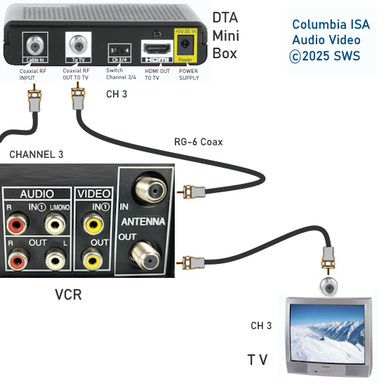 Index • How to Transfer/Copy Audio cassette to computer PC o How to connect HDTV with only optical audio output to stereo Cable TV Adapter Box - DTA Cable TV - Digital Terminal Adapter ![]() DTA Cable TV box - DTA Mini Box Originally all cable TV channels were analog. Digital channels came along and we had a hybrid system of both analog and digital channels. Well now your cable TV provider is all digital, converting those low numbered channels from analog to digital. This change is significant for anyone without a cable box, even those with a newer digital TV but no cable box because most cable tv providers scramble (encrypt) their channels. Sure some channels may come in the clear (unscrambled) but you know that one channel you want is going to be scrambled. This is why you need the DTA box if you have no other cable TV box. Xfinity/Comcast, Spectrum/Time Warner, COX and others implemented this change over time with the goal being an all digital channel lineup. You have a few choices such as renting the full-size, full-function digital cable TV set-top-box with DVR, program guide and on-demand features or go with satellite TV services or live with internet TV. But if you do not want premium cable services and just want the basic cable TV channels, you can rent a DTA or digital terminal adapter box. With the DTA box you get basic cable channels such as PBS, CBS, ABC, NBC, FOX and a few others. Plus you can get more channels in the range most likely up to channel 99 maximum if you buy additional subscriptions. These channels would include CNN and depending on your provider, such channels as National Geographic. The channels 100 and beyond probably would not be available. These include HBO, SHOWTIME and the like. Check with your provider to find out what channels are available. You can still use a VCR but you will not be able to view one channel while recording another unless you use two DTA boxes. ![]() Coaxial RF Cable RG-6 If you have a digital cable TV converter box from your cable TV provider then you may be fine and do not need to do anything. But if you have an older analog TV or even a newer digital TV, but you are not using any cable TV converter box from your cable TV provider, you may need to continue reading and take action. Otherwise you may not be able to view some of your cable channels. Many cable TV customers will go ahead and rent a full size digital cable converter box, some with a DVR to record shows, but these boxes can cost more per month than the digital adapter boxes. The digital adapter box costs less per month but also has less capability. What is the difference between a DTA box and a DTV box? The DTV converter box is a digital to analog TV converter box for local over-the-air broadcast TV reception so that an analog TV can view the current digital TV broadcasts. The DTA box is a digital to analog converter box for Cable TV which comes to you from a cable TV provider usually over a fixed coax cable so that an analog TV can view digital cable TV channels. Some DTA boxes provide an HDMI output for connection to a smart TV. What is the difference between a cable converter box and a cable adapter box or DTA? The cable TV adapter box (DTA) does not have the full on-screen program guide or on-demand programs. Typically the DTA adapter box is much smaller than a digital cable converter box. The DTA box has no record capability and usually has less channels available. When do you need a digital adapter box? If your cable provider informs you that analog cable channels are being converted to digital and you have no cable TV box at all for a TV. The adapter box will decode the scrambled digital channel and convert to analog (channel 3 or 4) or digital HDMI for your TV. This way you can still use an older analog TV or a digital TV which has an analog tuner. Any digital channel not scrambled can be viewed on a digital TV with a QAM tuner. Most digital TVs have a QAM tuner built-in. You can also connect to a VCR and tune it to channel 3 or 4 to record, then connect from VCR to TV using a coaxial cable. How do I connect the cable TV adapter box? Instead of a direct connection of cable to TV, the cable goes into the adapter box and the adapter box connects to the TV. The adapter box outputs on channel 3 or 4, so you tune the TV to channel 3 or 4 and select channels on the adapter box using the provided remote control. Some adapter boxes have an HDMI output which uses an HDMI cable connected to the HDMI input on a digital TV. ![]() ![]() ![]() For older analog TV or any standard definition TV, use coaxial RG-6 cable connection and tune to channel 3 or 4. ![]() Standard Definition TV is square, has a CRT (tube) and has no HDMI input ports. ![]() High Definition TV is a wide rectangle flat screen display with HDMI input ports HDMI Connection to High-Def digital TV ![]() HDMI Cable ![]() ![]() DTA box HDMI connection to HDTV using RG-6 coaxial RF cable and HDMI cable to TV HDMI input. Still want to use that old VCR? Yes, you still can, by connecting the adapter box to the VCR and the VCR to the TV. Tune the VCR to channel 3 or 4 and set to the time your program starts. ![]() Some Cable TV boxes are limited and are called DTA for digital terminal adapter. These smaller receivers may have HDMI output but some may only have RF coaxial output. Connect to VCR using RG-6 coaxial cable as shown in diagram. Tune to channel 3 or 4. The DTA mini box cable TV converters were offered by Cable TV providers to customers when the conversion from analog cable TV signals to digital Cable TV signals was implemented. Any customer with an analog cable box had to get a new digital cable box converter and the DTA was a basic and less expensive alternative to the full service digital cable boxes. Cable TV providers did not have a mandated switch from analog to digital cable television as part of the 2009 broadcast television transition. While broadcast television transitioned from analog to digital sig