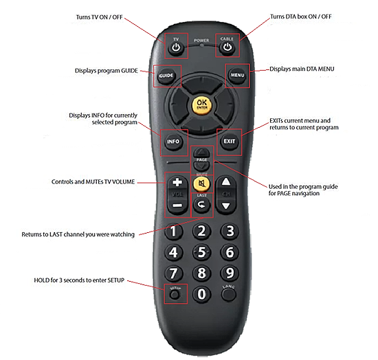 control to power on/off your TV so you often only need one remote. Your cable TV service provider may use one of many different brands of DTA mini box. Each manufacturer will use different procedures and may offer different remote controls. Some brands include Humax, Motorola, Cisco, Pace and others. Some service providers are phasing out traditional cable boxes in favor of streaming boxes such as Xumo. PACE DTA Mini Box - Remote Control Enable RF Remote Control Pairing Power on the TV and the DTA box. Switch the TV to the correct input/channel a. Insert two good batteries into the remote control. b. Press MENU on the remote control. c. Scroll to Remote Control in the Setup Menu. d. Scroll to RF Remote Setup (Advanced) and press OK/ENTER to enable RF remote pairing. Ensure you are NOT disabling the feature but enabling it. e. Scroll to IR Remote Setup (Advanced) and press OK/ENTER to disable IR remote capabilities. Ensure you are disabling the feature, NOT enabling it. Program the DTA Remote Control to control the DTA box a. Point the DTA remote control toward the DTA box. Press and hold SETUP until the "All Power" LED turns red, then release. b. Press and release MENU rapidly (up to 5 times) until the Remote Control Pairing overlay appears on-screen. ![]() c. Enter the three digit code that is displayed. ![]() d. Once the device is paired, you will see “Success!” displayed on-screen. Press OK/ENTER to complete the process. ![]() Program the DTA Remote Control to the TV (3 Options) Option 1: Popular Brands Method (see chart) a. Manually turn the TV on. b. Press and hold SETUP on the remote control until the LED blinks twice. c. Press the TV Power button on the DTA remote control. d. Press and hold the corresponding digit button for your TV brand. ![]() e. Release the digit button when the TV turns off. Setup is complete. f. Test the DTA remote to ensure the buttons now control the TV and DTA box. Option 2: Popular Brands Method (Remote Control User Manual) Manually turn the TV on. 1. Press and hold SETUP on the remote control until the LED blinks twice. 2. Find the manufacturer’s code for your TV from the Remote Control User Manual supplied with the DTA box. 3. Enter the code for your TV brand. 4. Press the TV Power button on the remote control to test. If the TV turns off, setup is complete. If the TV does not turn off, repeat steps above using the next code listed for your TV brand. 5. Test the remote to ensure the buttons now control the TV and DTA box. Option 3: Code Search Method a. Manually turn the TV on. b. Press and hold SETUP on the DTA remote control until the LED blinks twice. c. Press and hold down OK/ENTER. d. Release the button when the TV turns off. This may take a while. Setup is complete. e. Test the DTA remote to ensure the buttons now control the TV and DTA box. DTA Mini Box Remote Control The remote will be different depending on the DTA mini box. Press or long press (3 secs.) the SETUP button to enter the settings menu. Press the MENU button to enter the main menu options. ![]() The settings options available will be shown on the setup menu. You can adjust the picture resolution such as 1080 or 720 or set to "AUTO". ![]() Other settings such as Audio, channel locks, closed captioning or remote control options can be adjusted. Xfinity (Comcast) Pair, program, factory reset Xfinity remote control If you have Xfinity X1 box, a Xumo Stream Box, or Xfinity Flex, follow the steps below. Pairing means programming your Xfinity remote to control a specific single TV Box. Once a remote is paired, it will only work with that one TV Box — until you factory reset it. If you have multiple TV Boxes, make sure you're using the remote that’s paired with the box you want to control. Pair your Xfinity Voice Remote with your TV Box, TV, and audio equipment. Step 1: Pair with your TV Box Aim the Voice Remote at your TV Box. Press the Microphone (Voice) button and say, "Program remote." You’ll receive a notification that your remote is paired for voice control. Follow the on-screen instructions. Step 2: Pair with your TV When asked, “Do you want to use your remote to control your TV power and volume?" select Yes. Use the on-screen keyboard to type your TV brand. Then, select OK. When you see “Ready to pair”, select OK. Try changing the volume on your TV using the remote. If you can adjust the volume, select It Works! If you can't adjust the volume, select It Doesn’t Work and try again. Step 3: Pair with your audio equipment (optional) When asked, “Do you want to control your audio receiver using your remote?" select Yes (if applicable). If you don’t have audio equipment, select "Not Now" and you’re done! Type in the brand of your audio equipment using the on-screen keyboard. Then, select OK. When you see “Ready to pair”, select OK. Try changing the volume on your audio equipment using the remote. If you can adjust the volume, select It Works! If you can't adjust the volume, select It Doesn’t Work and try again. • YouTube video Xfinity X1 box setup Program your Xfinity remote to your TV or audio equipment using our online code lookup tool You can also use the online tool to connect your remote to your TV or sound system. • Xfinity Remotes Go to the Remote Code Lookup tool • Xfinity remotes device brands codes Choose the Xfinity remote you have. Remove the battery cover to see the model number. Click Continue. Follow the steps to program your remote. Can’t find your TV brand in the list? If your TV brand isn’t listed in the tool, try this if you have an: XR11 Voice Remote (with a Setup button) Turn on your TV. Press and hold the Setup button until the light at the top changes from red to green. Enter 9-9-1. The light should blink green twice. Press the CH ^ until the TV turns off. When the TV turns off, press Setup to save the code. Press the TV power button on the remote. If the TV turns on, you're all set! XR15 Voice remote (no Setup button, but 