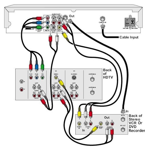 See over 100 hookup diagrams Cable hookup digital cable and TV Digital Cable Box Hook Up HIGH DEFINITION Cable Box to HDTV with VCR/DVD Recorder. ![]() Note: Recording High Definition TV shows - standard VCRs record on magnetic tape at 250 lines of resolution and cannot record High Definition TV shows, only standard definition. High Definition TV shows are 720 or 1080 lines of resolution. DVD is a standard definition format at 480 lines of resolution and until recordable High-Def DVD is available, possibly in 2009, you also cannot record High Definition TV shows on a DVD recorder, only in standard definition. Some DVD recorders will output an upconverted signal to your HDTV which comes close to 720 or 1080 for viewing purposes but cannot record to a recordable disc in HD. A DVR designed for High Definition recording can record to a hard disk in HD format. There are also D-VHS or digital VHS VCRs capable of recording in HD but these devices are not generally available. PREVIOUS PAGE > Digital Cable box to HDTV NEXT PAGE > Digital Cable box to HDTV with HDMI Search Columbia ISA See more... Input Select on TV and other devices Cable hookup digital cable and TV Audio Video Connections and cables HDMI Versions HDTV hookup options HDTV basic setup See over 100 hookup diagrams Columbia ISA Audio Video - Empowering consumers through information. columbiaisa@yahoo.com |