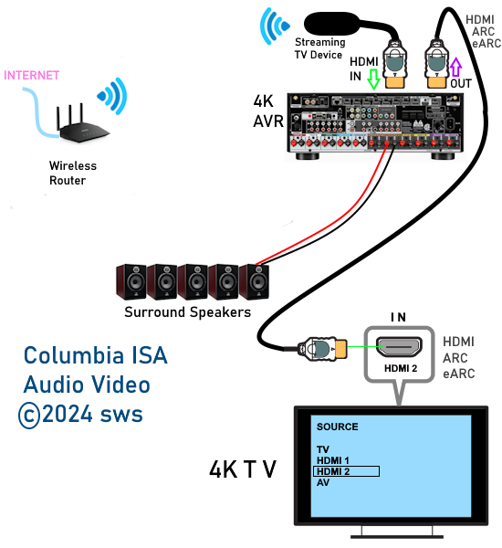 Hookup Diagrams Index Satellite Receiver to HD TV and A/V Receiver HDMI Columbia ISA home – › Wiring Diagrams Index • Netflix not working: How to Fix SEARCH *** Columbia ISA Audio/Video How to setup surround sound on a DirecTV satellite receiver DirecTV Gemini and DirecTV Gemini Air Satellite or Streaming TV ![]() How to connect a satellite TV box to a A/V Receiver and TV DirecTV Satellite TV Gemini Receiver ![]() Rear Ports - left to right: Ethernet (network), Optical (audio out), HDMI out, USB, power The DIRECTV Gemini device uses the Android TV operating system. This operating system allows the Gemini to function as a general-purpose streaming box. It integrates the traditional DIRECTV experience along with streaming apps such as Netflix, Hulu, and HBO Max (now Max). DirecTV Gemini Air Streaming TV box ![]() The DIRECTV Gemini Air streaming device uses a customized version of Google's Android TV. ![]() Connection diagram - DirecTV Gemini Air streaming TV Surround Sound Be sure your sound system has an HDMI input or optical/digital audio input. Your TV, soundbar, or A/V receiver needs to be set to the correct source input for the Gemini to be recognized. Step 1: Connect the Gemini device to your sound system. Plug the Gemini's HDMI cable into an HDMI input on your soundbar or AV receiver. If your soundbar or Audio/Video receiver has an HDMI output for the TV, connect that to your television. Alternatively, if your soundbar or receiver has an optical audio input, you may be able to connect the Gemini to the TV via HDMI, and then use an optical audio cable from the TV optical output to the soundbar/receiver optical input for audio. The optical connection will be limited to PCM stereo or Dolby Digital 5.1 surround sound. HDMI will be able to handle the best surround sound formats. Step 2: Adjust the Gemini's audio settings Press the Home button on your Gemini remote. Go to Settings. ![]() Select System > then Audio. ![]() Ensure that Audio Output or Dolby Audio is set to Surround Sound or On. ![]() Check if surround sound is working. If not, try setting to "Stereo" to see if this setting is working. If surround sound is available from the source you can see the audio channels displayed on the A/V receiver front panel. Note: The App must also support surround sound. DirecTV Gemini - set audio to surround sound How to Set Up Surround Sound for an older DIRECTV HD DVR Satellite Box Press MENU on your DirecTV remote control, select Settings & Help, then Settings to review or change your system settings. These include: audio options, video format, TV resolution, network setup, remote control setup and more. ![]() ![]() ![]() OLD DIRECTV RECEIVER AUDIO MENU ![]() Only two choices, ON or OFF. When set to ON Dolby Digital will play for programs that offer it. AUDIO: Dolby® Digital*: Select ON or OFF for Dolby Digital audio output to enable or disable a surround sound system. HD Channels include 5.1 surround sound when available from the source content program provider. Additional equipment is required (soundbar or Audio Video Receiver). NEWER DIRECTV RECEIVER AUDIO MENU ![]() Three choices, Dolby Digital Plus/ATMOS auto-detected or Dolby Audio surround or Standard 2-channel stereo. DIRECTV RECEIVERS ![]() ![]() Surround sound - how to get the sound you want PCM Audio PCM is 2-channel stereo audio, encoded the same way as CDs. It is a digital stream, which means the quality is pretty good, but you don’t get the real highs or lows, and the sound can be a little mechanical. Of course because this is a 2-channel source, you don’t get true surround. If your home theater receiver can decode Dolby Pro Logic II, you can get a simulated surround. Dolby Digital 5.1 Dolby Audio is the standard for most broadcasts. In most cases, you get five channels of audio (front left, center, front right, left and right rears) plus one channel of bass. The Dolby Audio standard does allow for up to seven channels of audio and two bass channels. In general though, you won’t find “7.2” in DIRECTV broadcasts because the content providers don’t offer it. Press MENU on your DirecTV remote. Scroll down to Settings. Arrow to Audio and press SELECT. Arrow down to Dolby Audio and press SELECT. If you have an older HD receiver, you’ll see a screen with a choice of “Off” or “On.” If you have a 4K Genie client you will have the choice between Off, Dolby Audio, and Dolby Atmos. Choose what you want by arrowing over and down, and pressing SELECT. Press EXIT to go back to TV. The audio delivered to you with the video of a program you view can be stereo or it can be surround. Stereo is 2 channel, 2 speaker audio, a left and a right channel/speaker setup. Stereo is used mostly for music but can be used as a soundtrack in movies. Your TV usually has a stereo speaker setup as does a vintage stereo receiver used to play vinyl stereo records or Compact Discs. DVD also contains a stereo soundtrack but also very often contains surround soundtracks. Surround differs from stereo in that surround has 6 or more channels and 6 or more speakers. So surround has more data and uses more space than does stereo. Surround can be down-mixed into 2 channel stereo. What is the difference between sound and audio? Sound is mechanical energy while audio is electrical energy. Sound occurs when air is moved or vibrated at frequencies the human ear/brain can interpret. Audio is electrical signals that when processed by electronic devices, can be converted into mechanical energy. Surround sound requires a soundbar or an Audio Video Receiver with multiple loudspeakers. If the program you are viewing has surround sound then you need to have your DirecTV Receiver connected to a soundbar or an Audio Video Receiver using either the HDMI cable connection or the optical or coaxial digital audio connection. This gets the audio from the DirecTV receiver to a processor so the digital audio can be decoded, amplified and converted to analog audio 