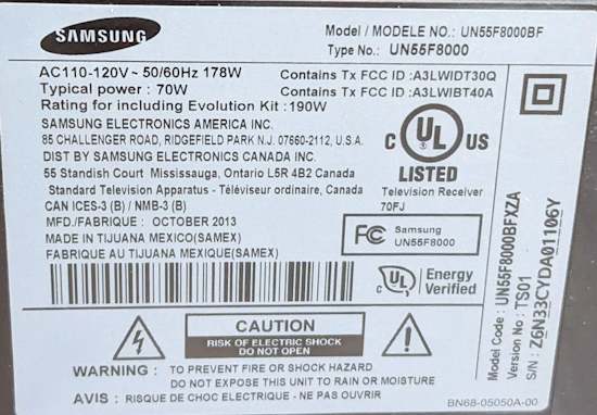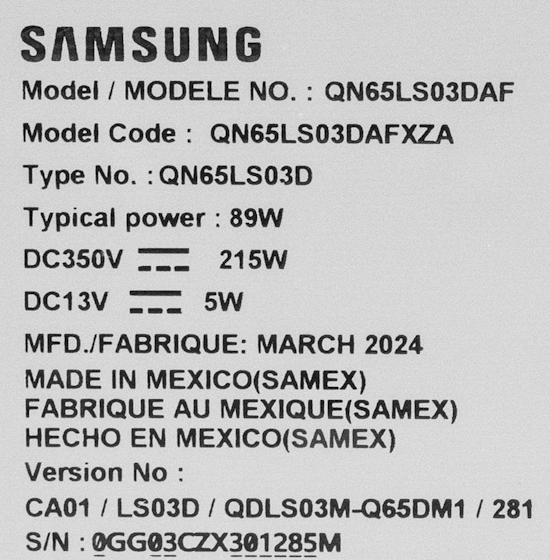 SAMSUNG TV Models SAMSUNG TV Models - LED, OLED, Plasma and LCD Samsung TV Models Samsung model designations - Find and decode Samsung TV model numbers and serial numbers. Samsung's TV model coding has changed over time and can be inconsistent across different models. How to find Samsung TV Model Number and Serial Number Locate your information on the back of the TV. ![]() ![]() ![]() Samsung TV rear label with model number and S/N ![]() Samsung TV rear label: Notice the model number and serial number on the far right in a vertical notation. You could also find this information by looking in the TV on-screen menus under "Settings" > "Support" > "About TV". ![]() Shows Model Number, Serial Number, Software Version and more information about the TV. Decode the model number 1st letter in model - Product P indicates Plasma L is LCD U is LED backlight LCD. Later model designations: Q is QLED H is DLP K is OLED (2013) 1st OLED models S is OLED or QD-OLED (2022 and later) 2nd letter in model: Region for which TV is made N = North America E = Europe A = Asia, Africa, Australia 3rd and 4th letters in model: Screen size: (55=55 inches) The next five chars. (5, 6, 7, 8, 9) refer to the specific TV model If letters 5 and 6 are LS, then the TV is a Life Style series where letters 7 and 8 are the type of TV, letter 9 is the year and letter 10 is the generation (A=1st, B=2nd, C=3rd): Samsung LifeStyle TV Type: 01 = The Serif 03 = The Frame 05 = The Sero T7 = The Terrace 5th letter: Year of manufacture: T = 2020 R = 2019 N = 2018 M = 2017 K = 2016 J = 2015 H = 2014 Older models: F = 2013 E = 2012 D = 2011 C = 2010 B = 2009 A = 2008 Samsung TVs (2021 and newer) The year is denoted by a letter following the product series code. A = 2021 B = 2022 C = 2023 D = 2024 F = 2025 Example: In the model QN65QN90DAFXZA (a 2024 model), the letter 'D' indicates the year 6th letter: Screen type (720p, 1080p, 4K, 8K) or Series M = High Definition (2017) N = High Definition (2018 and later) U = Ultra High Definition (4K) S = Super Ultra High Definition (8K) 7th letter: Series number 8th letter: Series model 9th and 10th letters: Series code for the U Series LED TV models 11th letter: Tuner type: F = ATSC / QAM (USA, Canada) U = DVB (Europe) G = ISDB-T (Latin America) T = 2 x DVB K = Asia W = Australia 12th letter: Design code is usually X meaning flat screen 13 and 14th letters: Country code: ZA = USA ZC = Canada ZG = Germany RU = Russia UA = Ukraine ZC = Chile XU = Europe/UK XY = Australia XL = India Example: LN37B550K1FXZA: A 37-inch LCD 1080P North American HDTV model. QLED Samsung TV QLED: Quantum Dot technology (2017 - 2025) QLED TVs came with new model numbers with 13 or 14 characters (8K models) Samsung TV Serial Number Decoding the Serial Number rather than the model number to find the Year is a much more reliable method. Identify the Serial Number Length: Samsung serial numbers are typically 15 digits long. Locate the Year Character: If your serial number is 15 digits: The 8th character is the manufacturing year. Check your serial number: 8th Character: Manufacturing Year 2001: R 2002: T 2003: W 2004: X 2005: Y 2006: A or L 2007: P 2008: Q 2009: S 2010: Z 2011: B 2012: C 2013: D 2014: F 2015: G 2016: H 2017: J 2018: K 2019: M 2020: N 2021: R 2022: T 2023: W 2024: X 2025: Y 9th Character: Manufacturing Month JAN: 1 FEB: 2 MAR: 3 APR: 4 MAY: 5 JUN: 6 JUL: 7 AUG: 8 SEP: 9 OCT: A NOV: B DEC: C The 6th letter is where the TV was manufactured: C = Mexico H = Hungary L = Russia M = Malaysia W = China 1, 3 = Korea S = Slovenia If your serial number is 11 digits: The 4th character is the manufacturing year. Samsung TV Model information SAMSUNG TV FALL 2009 Samsung appears to have been concentrating their efforts on the LED backlighting on many of their new 2009 models (6000, 7000 ,8000) called Samsung Luxia LED. An interesting new feature is the Internet@TV function which is an improved version of InfoLive, which uses an Ethernet port for connectivity. Samsung screen sizes range from 19 inch to 65 inch. SAMSUNG TV Models USA 2009 Samsung TVs Samsung 9 Series | UN46B9000, UN55B9000 The Samsung B9000 series is the very top of the range, flagship LED LCD HDTV from Samsung. Consisting of the 46-inch Samsung UN46B9000, and the huge 55-inch Samsung UN55B9000. Unlike the other LED HDTVs from Samsung, the Samsung 9000 series uses LED backlighting with local dimming, rather than edge lit LED. This enables even higher contrast ratios, for deeper colors, and more impressive black levels. Both sets also feature a wireless connection to a media unit, and Medi@2.0 support. Samsung 8 Series | UN46B8000, UN55B8000 The Samsung 8000 Series is an Ultra-Slim LED HDTV with Auto Motion Plus 240Hz. Available in 46-inch (Samsung UN46B8000) , and 55-inch (Samsung UN55B8000) sizes. Featuring an Ultra Slim Design with chrome styling, and 240Hz Auto Motion Plus, twice as fast as others for enhanced picture quality during fast motion scenes. The Samsung Series 8 8000 features Internet@TV technology. Samsung 7 Series | UN40B7000, UN46B7000, UN55B7000 If the ruby red coloring is not to your liking. Samsung also offer the 7000 series with a clear blue / grey bezel finish. Samsung 6 Series | UN40B6000, UN46B6000, UN55B6000 Samsung Series 7 750 Series | LN40750, LN46750, LN52750 The Samsung Series 7 750 / Samsung 750 Series is a range of LCD HDTVs with Auto Motion Plus 240Hz. Available in 40-inch, 46-inch, and 52-inch sizes. ToC design in semi-transparent ruby finish. Fast Motion Picture Response Time, matching that of traditional CRT displays. Internet@TV functionality is also featured. Samsung Series 6 650 ![]() The Samsung Series 6 650 ranges from 19- to 55-inches. With the 32-inch model and larger featuring 120Hz Auto Motion Plus technology, while the 40-inch model and larger features the new Internet@TV functionality. Samsung LN22650 | 22-Inch Samsung LN32650 | 32-Inch Samsung LN37650 | 37-Inch Samsung LN40650 | 40-Inch Samsung LN46650 | 46-Inch Sam
