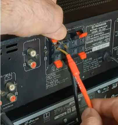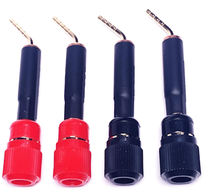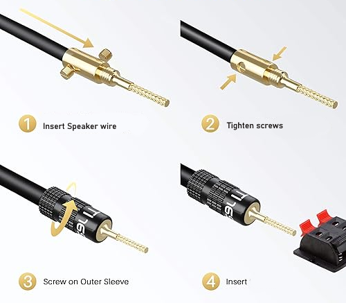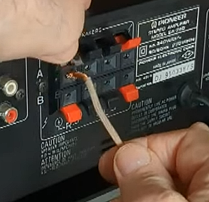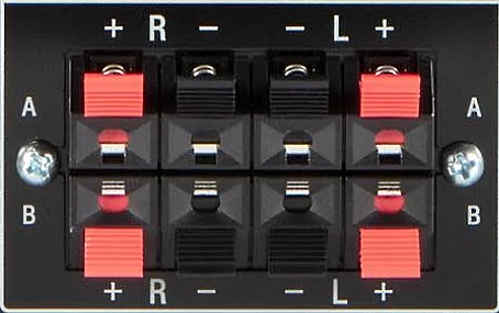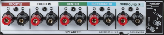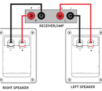 | Hook up Diagrams Index : Cable hookup digital cable and TV Connect your Loudspeakers Surround Sound Hook up Diagrams for Loudspeakers Speaker Cables The audio/video receiver amplifies the audio from the source and sends the signals to the loudspeakers for you to hear. You need a connection path from the receiver to the speakers and this is accomplished by using speaker wire or cable, a metal (usually multi-strand) wire used to connect the speaker outputs on an amplifier to the binding posts on a loudspeaker. The most basic speaker wire, also know as zip cord, is a thin, light gauge wire. ![]() Speaker wire is often made of copper, a good quality conductor. The metal wire is encased in some form of plastic coating that insulates the wire while still allowing the wire to be easily bent and turned. Most high-quality speaker wire is fairly thick with a gauge around 12. Quality wires are usually terminated with a metal connector. The most commonly used of these connectors are spade lugs, banana connectors, and pin connectors. Bare wire without a connector may also be used. Speaker cables should be heavy gauges with gold-plated spade lug or banana connectors for good signal transfer between amplifiers and speakers. Lengths of speaker cable should be kept to a minimum. Long runs of speaker wire should be heavy gauge to ensure enough power is transferred and the amplifier is not presented with too great an impedance or resistance. Speaker wire has its own impedance or resistance to the flow of electric current with heavier gauge cables having lower resistance ratings allowing the efficient flow of power from the amplifier to the speakers. How many Speakers Depending on your receiver, you may have two speaker connections, left speaker and right speaker for stereo or you may have 5 or more speaker connections for surround sound home theater setups. Types of Speaker Posts (Terminals) on a Receiver A budget stereo receiver will have at least one or two sets of relatively large terminals that are designed to accept speaker wire. Some models use only wire spring clips, which accept bare wire or pin connectors. ![]() Budget Stereo Receiver Spring Clip Speaker Terminals You only need to connect four wires, two for the right speaker (R) and two for the left speaker (L). Red is positive (+) and black is negative (-). Typically you only connect the "A" speakers (top row). The "B" speakers (bottom row) would be used for a second set of stereo speakers possibly in another room or used for a passive subwoofer speaker. ![]() ![]() Speaker wire pin connectors make the job much easier than using bare wires. You can also use adapters for banana plugs. ![]() ![]() ![]() Adapters for banana plugs. These allow you to use banana plugs even though you have spring clip terminals on your receiver. ![]() Stereo (2-channel) Speaker Connections to Receiver 4 wires, two to each speaker, connect plus to plus and minus to minus. Pro Tip: PC-OFC wire stands for Pure Crystal Oxygen-Free Copper, a high-purity copper wire (often 99.99% or higher) refined to remove oxygen, so as to significantly boost electrical conductivity, reduce resistance, and prevent corrosion, making it ideal for high-performance audio speaker systems. The color of the wires do not matter as long as you maintain consistency, meaning the one wire you choose for the positive connection is always used for positive, end to end, and the one wire you choose for negative is always used for the negative connection end to end. Wires can be sold in any colors or in coded stripes so you know one wire from the other. Surround Sound Receivers ![]() Speaker binding posts on receiver with 5 channels also will usually have a 6th channel for a subwoofer speaker. These allow bare wire, spade, banana plugs, pins etc. Just unscrew, insert and tighten down again. Better, more expensive models usually have binding posts for at least the front left and right speakers. Binding posts normally accept bare wire, pins, banana plugs, and spade lugs, though some omit support for one or the other of the last two. Bare wire and spade lugs provide the most secure connections, because they have the large contact areas and can be clamped down tightly. Snugly fitted banana plugs are almost as secure, and much more convenient when you need to disconnect and reconnect for any reason. ![]() Banana connections allow a quick connect or disconnect. Although there is a thriving market in premium speaker cable, there is no real technical or sonic imperative for using wire of premium construction or exorbitant price. Ordinary stranded copper wire (lamp or zip cord) is perfectly satisfactory provided that it is not too skinny. The thicker the wire, which corresponds to a lower gauge number (AWG), the less its resistance to the passage of electricity. The thinnest wire you should possibly consider using is 18-gauge, but since 16-gauge costs only slightly more, it is recommended. For long runs of more than 15 or 20 feet, you might consider moving up to thicker 14- or even thicker 12-gauge cable. If you do, just make sure whatever you buy is reasonably flexible; such thick cable can be too stiff to handle easily if it is not braided to maximize flexibility. How do I connect my speakers? Speaker wire consists of two leads, typically encased and bundled in plastic insulation, one for the positive signal, and one for the negative. Your speaker wire will probably be marked in some fashion like (+) and (-) or if not, you can look for colors or wire types to help you distinguish the two leads. Low cost speaker wire has a copper color wire and a silver color wire (actually just tinned copper) to help you connect it correctly. The two wires connect to the two terminals on the back of the speaker and then to the positive and negative posts on the back of the receiver. Do this for each speaker in your system, connecting the proper speaker (center, left front, right front etc.) to the correct place on the back of 