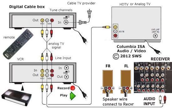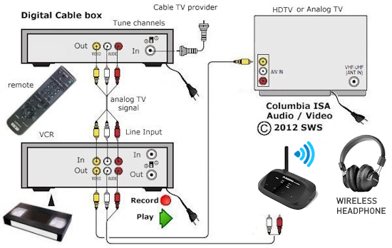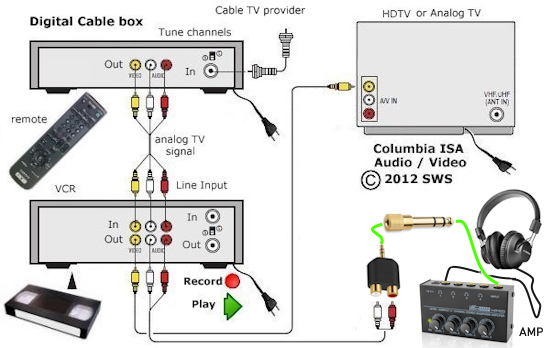 The following diagrams show how to connect VCR, TV, and cable box. Remember there are always many ways to connect components. The use of switches and adapters often allow for an even greater number of options. ![]() Basic VCR to TV connections ![]() VCR REAR Connection ports Audio/Video Inputs and Outputs VCRs have an analog TV tuner built-in so in the old days, a TV antenna could be connected to the silver threaded coaxial cable input port for recording TV shows. The other silver threaded coaxial cable port is for output to a TV for viewing, usually on channel 3 or 4. ![]() PLAY video tapes to CRT TV, simple coaxial cable connection Connect RG-6 coaxial cable from VCR out to TV antenna input ![]() RG-6 Coaxial Cable ![]() TV Rear ![]() Insert copper pin of RG-6 cable into small hole of TV antenna input port. Then align threads and turn clockwise until a secure connection is tight and fixed. An alternative connection, which yields better video and possible stereo audio, is the RCA phono cables connection (yellow video) and (white, red audio) from VCR OUT to TV Inputs. Be sure to switch to the TV AV input using the TV remote. ![]() ![]() ![]() VCR RCA cables connections RECORD to VCR - Digital Cable TV Receiver PLAY to TV ![]() Cable TV Receiver REAR Outputs include Component video for High Def video (green, blue, red), HDMI for High Def video and audio and also for standard definition video, the yellow, white, red RCA outputs. These can connect to a VCR's yellow, white, red inputs. ![]() Tune channels on the Cable TV box. Record LINE 1 or 2 on the VCR (set to record from LINE input). HD Digital Cable Box - HDTV ![]() Connect HDMI cable from Cable box HDMI OUT to TV HDMI input and select that HDMI input on the TV when viewing cable channels. The 3 RCA cables to the VCR from the cable box for recording and for viewing VHS tapes, the 3 RCA cables from VCR OUT to TV RCA inputs. Select the RCA AV input on the TV. Use RCA to HDMI adapter if TV only has HDMI inputs. ![]() Some Cable TV boxes are limited and are called DTA for digital terminal adapter. These smaller receivers may have HDMI output but some may only have RF coaxial output. Connect to VCR using RG-6 coaxial cable as shown in diagram. Tune to channel 3 or 4. The DTA mini box cable TV converters were offered by Cable TV providers to customers when the conversion from analog cable TV signals to digital Cable TV signals was implemented. Any customer with an analog cable box had to get a new digital cable box converter and the DTA was a basic and less expensive alternative to the full service digital cable boxes. Cable TV providers did not have a mandated switch from analog to digital cable television as part of the 2009 broadcast television transition. While broadcast television transitioned from analog to digital signals in 2009, cable companies were not required to follow suit, and most transitioned to digital cable gradually over time, with some completing the switch to digital during the 2013 to 2015 time frame. ![]() Cable TV DTA mini box ![]() Connection diagram DTA mini box ![]() Record Cable TV RECORD to VCR - Digital to Analog TV Receiver PLAY to TV ![]() TV receivers/converters take the digital signal from the antenna input (RF coaxial) and output an analog TV signal from the RF coaxial output or the RCA AV outputs or even an HDMI output on some models. ![]() Scan for local channels on the converter. Tune channels on the converter using the converter's remote. Record one channel while watching another ![]() Use a splitter to supply both the TV and a DTV tuner/converter with broadcast TV signals. This setup could also be used to view channels on two TVs (or up to four TVs) which could be in different rooms. TV sound to external speakers ![]() Connect the RCA white and red analog audio cables to a sound system audio input for richer sound than you get from the TV speakers ![]() Powered Speakers have a built-in amplifier. ![]() Powered speakers can offer a variety of inputs from RCA to USB to HDMI and optical. ![]() Connect the VCR's audio outputs to powered speakers for a richer movie or TV content experience. ![]() Connect VCR audio output to surround sound receiver. Connect white and red RCA cables to white and red audio inputs on the receiver. Select the correct source input on the receiver. Adjust volume on the receiver. You could also connect headphones to the receiver's headphones output jack. Connect headphones to VCR Wired or Wireless Headphones Wireless headphones use various technologies such as RF (radio frequency) or Bluetooth. RF headphones can receive audio up to around 100 to 300 ft. while Bluetooth typically is 30 to 100 ft. Some units can send audio to multiple headphones, each with their own volume control. For wireless headphone hookup, connect the VCR white and red RCA audio outputs to the RF headphone base station's RCA or 3.5mm input. The transmitter in the base station sends the audio to the RF headphones which should have volume control. Bluetooth works with a Bluetooth transmitter connected to the VCR's audio output. Using Bluetooth wireless headphones to receive the audio from the transmitter, you can listen to the sounds from the VCR. Bluetooth has had some limitations such as audio lag, however Bluetooth technology is advancing every year so get the newest version. For wired headphones, connect the VCR's white and red audio outputs to a headphone amplifier. These can be very inexpensive and can send audio to four different headphones so multiple people can listen with their own volume control. The advantage of wired over wireless is no interference, lag or dropouts however, the disadvantage is physical wires as opposed to the more convenient wireless setup. ![]() Connect VCR to wireless headphones hookup diagram ![]() Wired Headphone Amplifier ![]() ![]() ![]() ![]() Connect VCR to wired headphones hookup diagram TV Streaming media Add a streaming media device for internet viewing. You can also setup