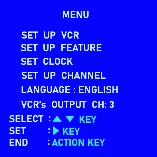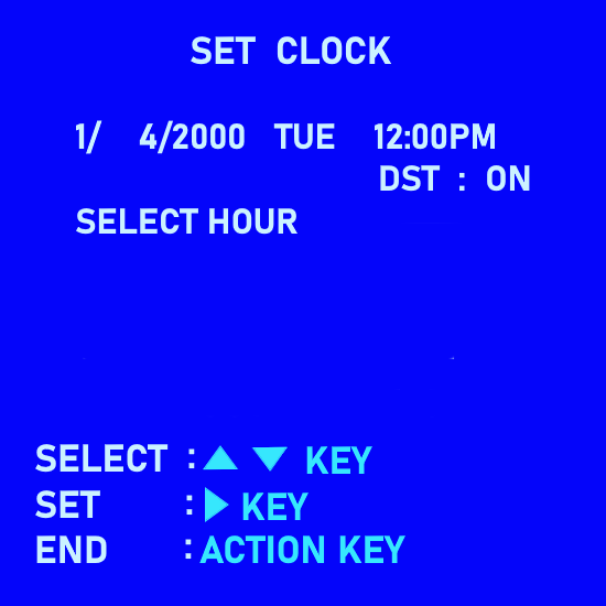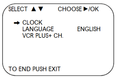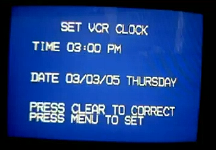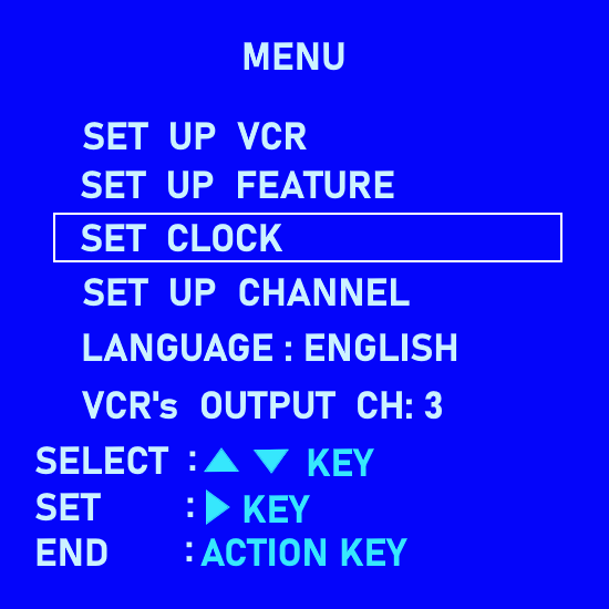 After you press the MENU button, the On-screen Main Menu is shown on the TV. The MENUS are presented in a cascading style. That is to say, each item that can be selected will present sub-menus until all your choices are exhausted. You will use your remote control arrow keys to navigate to your selections. Use the UP/DOWN arrow keys to move to the CLOCK SET line. Then press OK or ENTER or FFWD depending on your model of VCR. Basically you move up, down, and right, left using the arrow keys. When you put the cursor on the item you want, press OK, Enter, or FFWD to get the next menu. Arrow buttons UP or DOWN to select menu items and arrow buttons LEFT or RIGHT to change/adjust value of items. Your VCR's menus may look a little different but the same information will be there, namely, YEAR, DATE, HOUR, MINUTE, AM/PM To set the clock, use the arrow keys to move to each item (RIGHT/LEFT) and then UP/DOWN to increase or decrease the value of the item until you have the value you want. For Example: