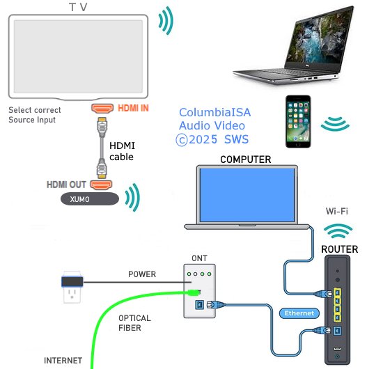 100 Diagrams – › Wiring Diagrams SEARCH *** Columbia ISA Audio/Video : Cable connections : Cabling Diagrams Hookup diagrams index ![]() Cable TV hookup diagram - traditional cable TV receiver box ![]() Cable TV hookup diagram - streaming TV receiver box ![]() Cable TV hookup diagram - streaming TV receiver box (fiber) TV Cables Connections Modern flat screen TV connections: ![]() There are two more connections which are inside the TV, the Bluetooth and the Wi-Fi wireless connections. The Bluetooth wireless connection is used for stereo audio. The wireless Wi-Fi is used to connect to a wireless router for internet access or a Wi-Fi device. TV Connections Explained USB - Universal Serial Bus The TV USB port allows you to play digital media files (images, videos, music) from a small flash drive inserted into the USB port. The flash storage drive has to be formatted (FAT32 which has a 4GB maximum file size or exFAT for much larger files) so the TV will recognize the digital files such as MP3 for music. Check the TV specifications for maximum capacity and compatible formats. ![]() 32GB to 512GB is typical. 4TB, 8TB, 16TB, 64TB are available. ![]() The average song in MP3 format will take up 3 to 7 MB so a 32GB flash drive can store thousands of songs. A 128GB flash drive can store from a few thousand to over 100,000 images, depending heavily on the photo's resolution (megapixels). You can also power devices like adapters or TV streaming sticks (low power only), or update the TV's software from a download. These ports are usually on the back or side of the TV and are accessed through the TV's source menu. ![]() TV USB port - USB Type A is standard ![]() USB flash drive - push into TV USB port firmly Optical - Digital Audio Output The TV optical port uses a fiber-optic audio cable to send high-quality digital audio (like 5.1 surround) from the TV to a soundbar, powered speakers, AV receiver, or home theater system for output to speakers. It only carries audio, not video. It cannot send advanced audio formats like Dolby TrueHD often found on Blu-ray discs. HDMI is needed for those formats. ![]() TV Optical Audio Output port ![]() ![]() Optical Audio Cable Digital audio PCM or Dolby Digital Headphones - Analog audio output Some TVs have a 3.5mm stereo headphones output. Usually green or black, it uses a 3.5mm stereo audio cable connection. TV with no headphone out Solution 1 - HDMI ARC: If a TV does not have a headphone output, you can use an HDMI audio adapter to connect wired headphones. Connect an HDMI cable from the TV's HDMI ARC port to the HDMI audio adapter and then plug the headphones into the HDMI audio adapter's 3.5mm port. Switch the TV sound out to HDMI instead of the TV speakers. ![]() Solution 2 - Optical audio out: Use a DAC (digital to analog converter) to convert the optical digital audio to analog stereo. These small devices usually have RCA and 3.5mm headphones outputs. Connect the optical from the TV using an optical audio cable to the DAC and then connect the headphones to the DAC output. ![]() Switch the TV Sound Out to Optical instead of the TV Speakers. Solution 3 - Wireless Bluetooth: You could also use Bluetooth wireless to connect a wireless Bluetooth headphone. Pair and connect by switching the TV sound output to the Bluetooth device. Composite Audio Video Budget TVs can still offer the old style RCA yellow, white, red analog audio video inputs. Some TVs have a 3.5mm combination input, usually yellow, which can be used to connect a VCR or older DVD player when used with an adapter cable. ![]() RCA yellow Video and white/red Stereo audio cables. Push cables straight in until tight. Match colors. ![]() ![]() AV adapter cable with RCA and 3.5mm connections HDMI The 19 pin HDMI port on a TV is used to connect Blu-ray or DVD players with an HDMI output or streaming TV devices, games, or other devices with HDMI outputs. One of the HDMI ports is the HDMI ARC/eARC input (audio and video) and output (audio) used to connect a soundbar or AV Receiver for better sound. ![]() ![]() HDMI Cable - High Definition Video and High Resolution Audio in one cable. Usually 19 pin. Ethernet This port connects the TV to the internet through a router. This alternative to the wireless Wi-Fi connection is faster and more reliable. ![]() ![]() Ethernet cable Push cable straight in until it clicks into place. ![]() TV wired connect to internet Antenna Over-the-air local TV broadcasts can be received using a TV antenna connected using an RG-6 coaxial cable. Perform a channel scan to save all the local channels in the TV memory. ![]() ![]() RG-6 Coaxial Cable - Video and audio on one cable. Copper wire is inserted into round hole and cable collar is turned until tight. Used for TV antenna connection. ![]() HDMI 4K TV and Soundbar connection ![]() Source device can be Bluray/DVD player, Cable TV receiver, Streaming device. Select correct source input on TV and Soundbar. Set TV to output sound to HDMI eARC/ARC. What if my TV does not have ARC/eARC? How do I connect Soundbar? Most TVs will have an optical audio output and your soundbar almost always has an optical audio input. Use the optical audio cable connection. Set the TV to output sound over the optical output and select the optical input on the soundbar. ![]() Older analog TV TV - VCR - DTV Converter Box connection ![]() RG-6 Coaxial cable connections • PLAY VHS tapes from VCR to TV • RECORD to VCR from DTV box • VIEW TV shows from DTV box to TV ![]() RF Modulator The RF Modulator converts a signal from one electronic device into a signal that can be used by a different electronic device. After the 2009 switch from analog to digital broadcast TV, a TV digital to analog converter box is required for analog TVs and for VCRs. For a TV with only an RF input, use a RF Modulator to connect VCR, DVD and TV tuner with antenna. ![]() Tune TV to channel 3 or 4. Change channels on TV converter box. VCR, DVD, satellite box or TV tuner box connectio