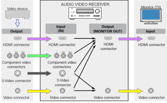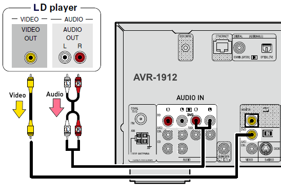 Pioneer's LD-700 was the first consumer player to use a solid-state laser, transitioning from the larger and more complex helium-neon gas lasers used in earlier models. It was also the first LaserDisc player to incorporate a front-loading disc bay, a feature that made the player more convenient to use and paved the way for the design of modern CD and DVD players. Before the LD-700 Before 1984, all consumer LaserDisc players used helium-neon (He-Ne) gas lasers to read the discs. A more modern Pioneer LD player from 1995, the model CLD-D704 has a dedicated CD tray and can play Dolby Digital AC-3 laserdiscs. ![]() ![]() Pioneer discontinued production of all LaserDisc (LD) players in January 2009. The final models produced by Pioneer are the DVL-919 (DVD/LD compatible player), CLD-R5 (LD/CD player). Q: How can I connect my Laserdisc Player to my flat screen TV? A: Some TVs only have HDMI inputs while other budget TVs may have RCA composite video inputs. One of the ways to connect and get video upscaling is to connect the LD player to an A/V receiver which has composite video inputs and offers upscaling to HDMI out. Then connect the A/V Receiver's HDMI OUT to the TV's HDMI INPUT. There are also RCA composite video to HDMI converters/adapters. ![]() Video upscaling is offered with some modern A/V Receivers while others only offer HDMI output from a composite or component video input source. Also known as "Video Conversion". If the AV receiver has both video conversion and video upscaling, the receiver automatically converts the input analog signal to a digital one and can then upscale it to a higher resolution. Denon receivers offering Analog (RCA composite) to HDMI Video Conversion: AVR-X8500HA AVR-X8500H AVR-X8500H AVR-X7200WA AVR-X7200W AVR-X6700H AVR-X6500H AVR-X6300H AVR-X6200W AVR-X5200W AVR-X4700H AVR-X4500H AVR-X4400H AVR-X4300H AVR-X4200W AVR-X4100W AVR-X4000 AVR-X3600H AVR-X3500H AVR-X3400H AVR-X3300W AVR-X3200W AVR-X3100W AVR-X3000 AVR-X2200W AVR-X2100W AVR-X2000 AVR-S910W AVR-S900W AVR-E400 AVR-A110 AVR-4520CI AVR-3313CI AVR-3312CI AVR-2313CI AVR-2312CI AVR-2113CI AVR-2112CI AVR-1913 AVR-1912 (year 2011) Q: Does the Denon AVR-1912 automatically send composite video to HDMI out? A: Yes, the Denon AVR-1912 automatically converts analog composite video to a digital signal and outputs it via its HDMI port. This feature, known as video conversion or up-conversion, allows you to connect older analog video sources and manage them with a single HDMI cable connection to your TV HDMI input. This capability is not present on all Denon receivers, but it is explicitly available on the AVR-1912. The receiver digitizes the analog composite video and passes it through its HDMI output, though it does not perform advanced upscaling to a higher resolution. This means you can connect devices like a VCR, older game console, or LD or DVD player using composite (yellow RCA) cables to the AVR-1912 and view them on your modern TV via its HDMI input. The Denon A/V Receiver AVR-1912 has both RCA composite video output to a TV and HDMI output to TV. Video conversion from RCA composite to HDMI is available. ![]() Laserdisc player connect to receiver DVD ![]() Denon AVR-1912 DVD composite video input and monitor composite video output to TV ![]() Denon AVR-1912 analog audio input DVD Select on the receiver or the remote control, the DVD source input. ![]() Video output to TV from receiver (RCA composite) Composite video input to HDMI output on AVR-1912 receiver Although the Denon AVR-1912 does not perform video upscaling, you can output the composite video input to HDMI out to the TV. Video Conversion is the process where a composite or component input video signal is converted to HDMI for the video output to a TV. ![]() HDMI out to flat screen TV ![]() A/V Receiver HDMI out to TV Setting up the A/V Receiver options Connect Receiver to TV, switch to correct input and use the AVR's User Interface to adjust audio and video options. ![]() On the remote control RC-1156, press "MENU" button. ![]() ![]() ABOUT LASERDISC: Video was stored on LD as an analog signal, while audio could be stored in a combination of several different formats. Like on a CD, the surface of the disc is an aluminum foil covered by pits and lands, but whereas on a audio CD (or DVD) the pits and lands will signify binary codes, on a LD the distance between two pits represents an analog sample level, the accuracy of which is dependent on the quality of the measurement. NTSC LDs carried two analog audio tracks, plus two uncompressed CD-quality PCM digital audio tracks. PAL discs could carry one pair, either analog or digital. Some later LDs featured 5.1 channel Dolby Digital in place of the right analog audio track, and a small number included 5.1 channel DTS in place of the standard digital tracks. Laserdiscs were recorded in one of two formats: CAV (constant angular velocity) or CLV (constant linear velocity). CAV discs were spun at a constant rotational speed during playback, with one video frame read per revolution, whereas CLV discs spun progressively slower as the disc was played from inside edge to outside edge. CAV could hold up to 30 minutes of content per side, while CLV could hold twice that. The advantage of the CAV format was that its simpler playback method allowed "trick play" features such as freeze frame, slow motion, and reverse on all LD players, unlike CLV which only supported those features on high-end models with digital video buffers. The vast majority of titles were only available in CLV. LD had a number of advantages over VHS. It featured a far sharper picture and level of sound quality, with the ability to deliver multiple audio channels, both analog and digital. This allowed "special editions" of movies with extras like director commentaries to be released. Access was random, meaning that one could go to any point on the disc very quickly (depending on the player and the disc, within a few seconds at the most). As LDs 